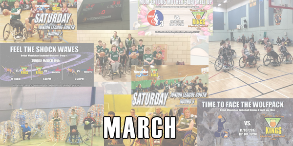 March saw "Medicine Man" Joe Seward organising a Zorb football fundraiser event, Kings founder Jacqueline was announced as a semi-finalist for a Thames Valley Venus Women Awards, The Division Three side saw a return fixture against Worcester Wolves which ended in a Wolves victory and a huge win against CWBA 3 on Mother's day, The division four team saw their season start with two huge wins plus another two huge rounds of Junior League seeing both the Under 15s and 19s reach national finals!